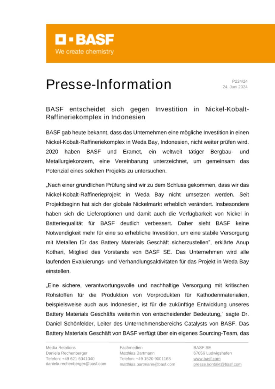 Today, BASF announced that the company will not further evaluate a potential investment in a nickel-cobalt refining complex in Weda Bay, Indonesia. In 2020, BASF and Eramet, a global mining and metallurgical group, signed an agreement to jointly assess the potential of such a project.