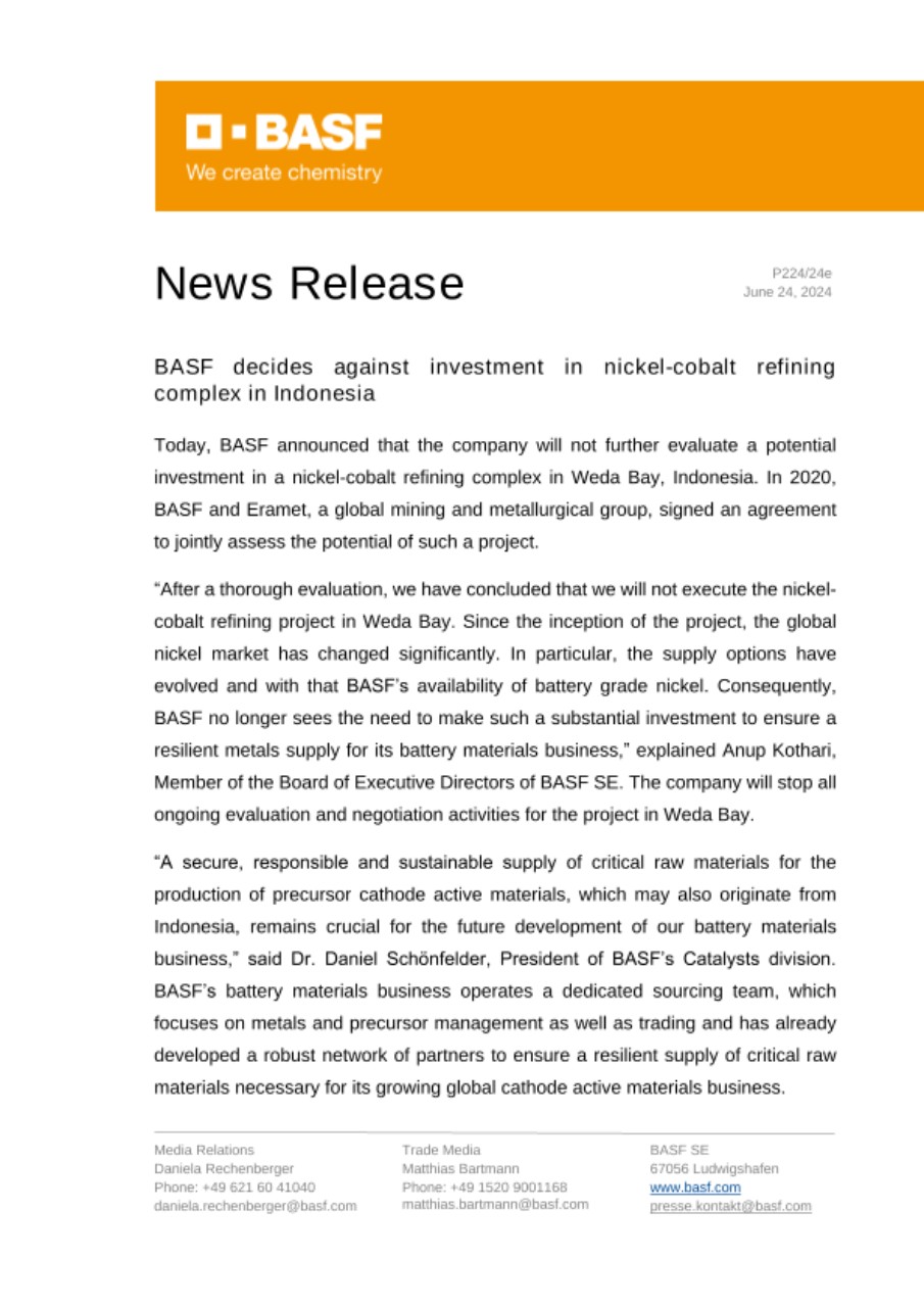 "After a thorough evaluation, we have concluded that we will not execute the nickel-cobalt refining project in Weda Bay. Since the inception of the project, the global nickel market has changed significantly. In particular, the supply options have evolved and with that BASF’s availability of battery grade nickel. Consequently, BASF no longer sees the need to make such a substantial investment to ensure a resilient metals supply for its battery materials business," explained Anup Kothari, Member of the Board of Executive Directors of BASF SE. The company will stop all ongoing evaluation and negotiation activities for the project in Weda Bay.